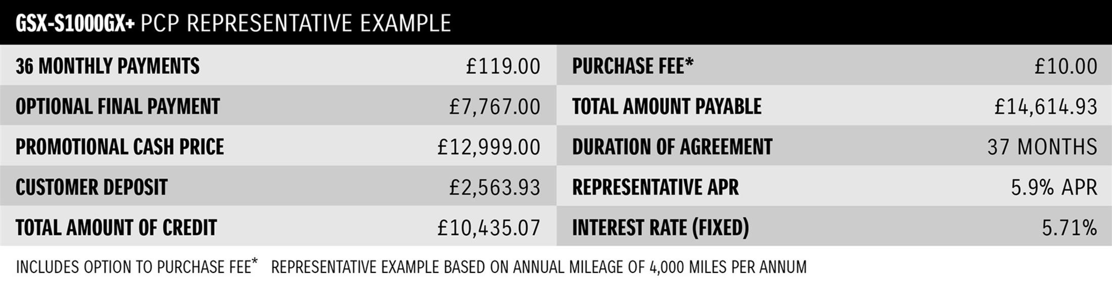 PCP Finance offer applies to the purchase of a new GSX-S1000GX+ only from a participating Suzuki Dealership. The motorcycle must be purchased and registered between 01/04/2026 and 30/06/2026 to qualify for the offer. £1,000 minimum deposit required. Credit subject to status, UK residents aged 18+. Suzuki Financial Services Ltd, St.William House, Tresillian Terrace, Cardiff, CF10 5BH. ?Finance figures applicable at time of print and are subject to change. Representative Example is based upon an annual mileage of 4,000 miles per annum.? With PCP, once you have paid all of the regular monthly repayments you have the option to: 1. Return the motorcycle and not pay the Optional Final Repayment. In this example if the vehicle has exceeded 12,333 miles, a charge per excess mile will apply of 6p plus VAT will apply per excess mile. If the motorcycle is in good condition (fair wear and tear accepted) and has not exceeded the maximum agreed mileage, you will have nothing further to pay, 2. Pay the Optional Final Repayment to own the motorcycle, or 3. Part exchange the motorcycle subject to settlement of your existing credit agreement; new credit agreements are subject to status.?