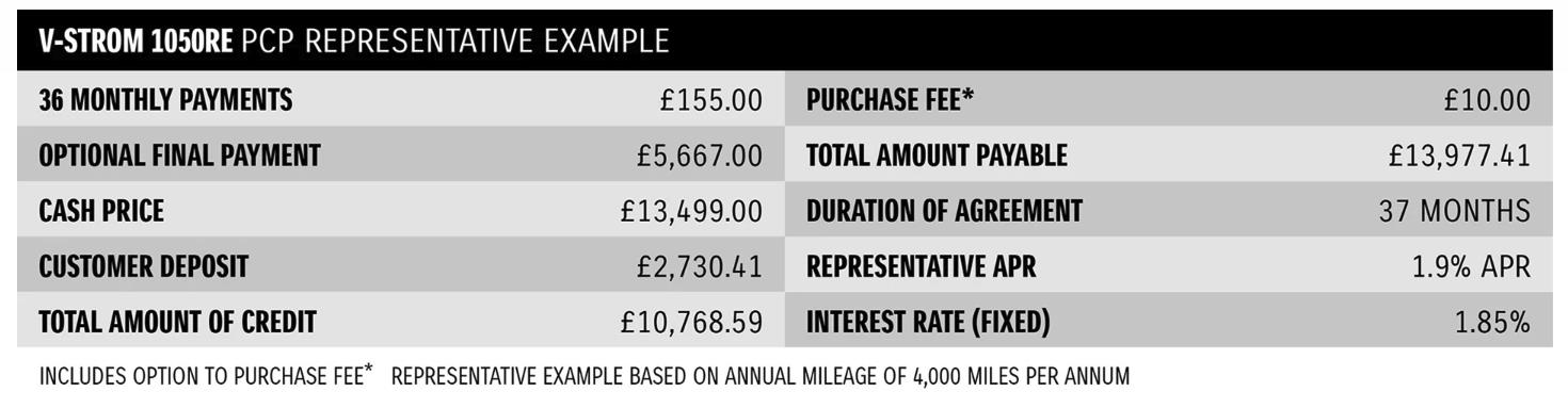 PCP Finance offer applies to the purchase of a new V-Strom 1050RE only from a participating Suzuki Dealership. The motorcycle must be purchased and registered between 12/01/2026 and 31/03/2026 to qualify for the offer. £500 minimum deposit required. Credit subject to status, UK residents aged 18+. Suzuki Financial Services Ltd, St.William House, Tresillian Terrace, Cardiff, CF10 5BH. ?Finance figures applicable at time of print and are subject to change. Representative Example is based upon an annual mileage of 4,000 miles per annum.? With PCP, once you have paid all of the regular monthly repayments you have the option to: 1. Return the motorcycle and not pay the Optional Final Repayment. In this example if the vehicle has exceeded 12,333 miles, a charge per excess mile will apply of 6p plus VAT will apply per excess mile. If the motorcycle is in good condition (fair wear and tear accepted) and has not exceeded the maximum agreed mileage, you will have nothing further to pay, 2. Pay the Optional Final Repayment to own the motorcycle, or 3. Part exchange the motorcycle subject to settlement of your existing credit agreement; new credit agreements are subject to status.?