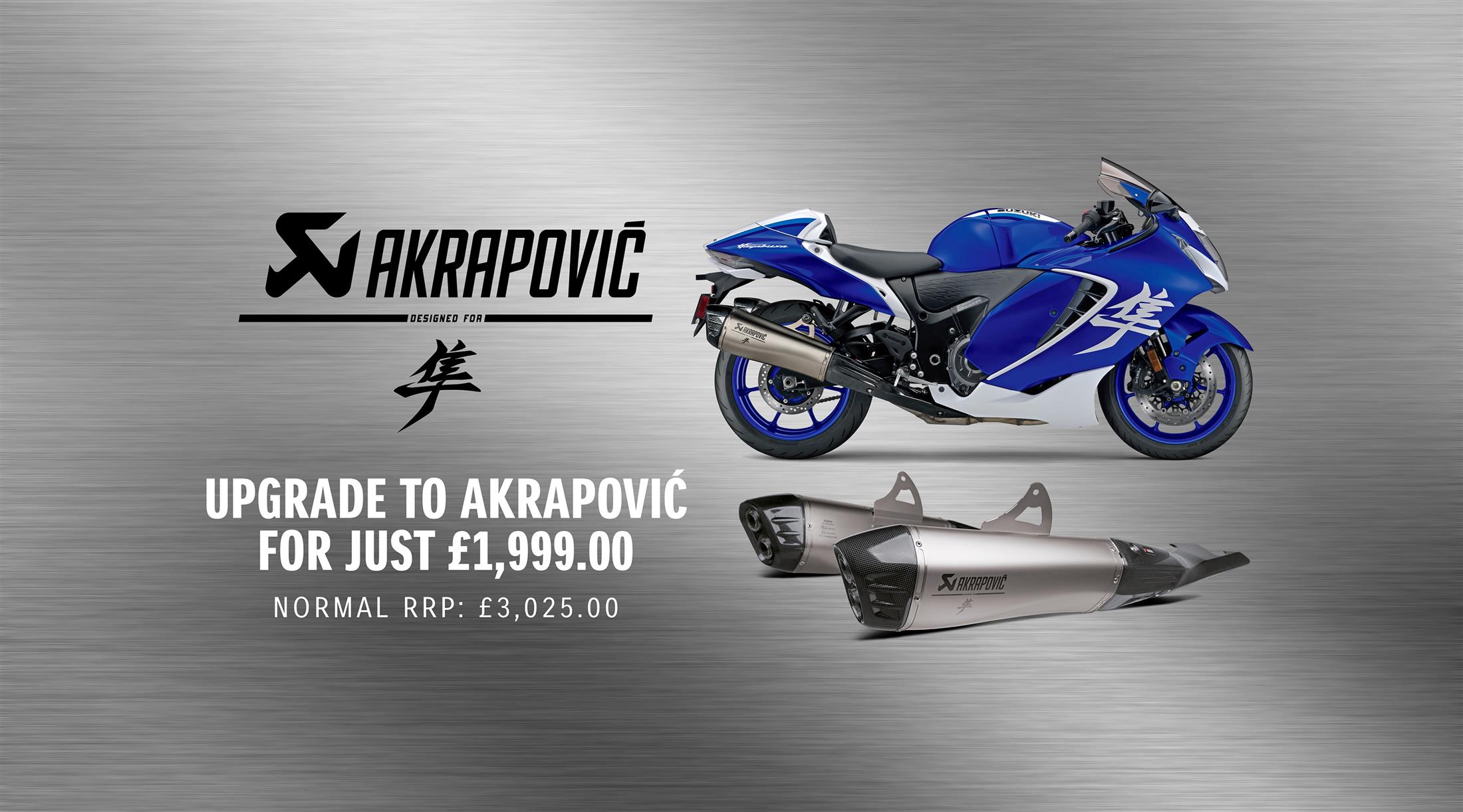 Purchase a new Hayabusa or Haybusa Special Edition and upgrade to the official Akrapovic exhausts for just £1,999. With an RRP of £3,025, the offer represents a saving of over £1,000.