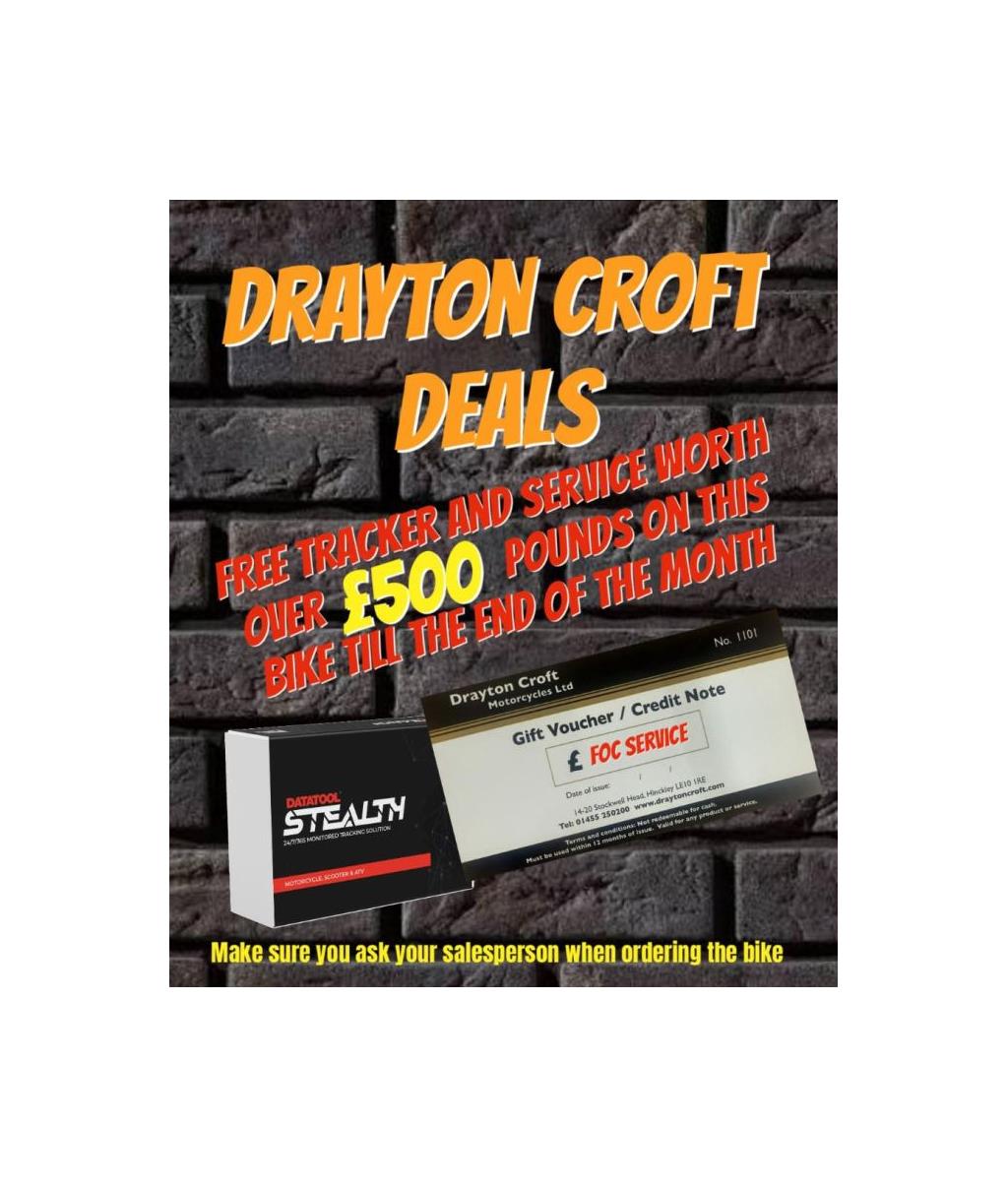 All our bikes come with a HPI report and undergo a pre delivery inspection before they leave us, they also have 3 months mechanical warranty and 12 months MOT (if needed). * FINANCE AVAILABLE WITH MULTIPLE FINANCE COMPANIES, SUBJECT TO STATUS ** Please Contact Our Sales Department For More Details 01455 250 200 or Whats App message us on 07377 141398 And To Make Sure This Machine Is Still Available Before You Travel, or view this bike instore 9am to 5pm Monday to Saturday. Offering you over 200 New and Used Bikes, All Bikes can be reserved online 24/7 on our website www.draytoncroft.com we operate a fixed price policy – the price you see is the price you pay! No fees, no catches. We can also offer UK Mainland delivery. If you want to collect a bike and ride it home, we offer a customer collection service. Our knowledgeable sales personnel do not earn commission, so you won’t get the hard sell. We want our customers to return to us time and time again, so we work hard to make sure you get the best bike for you, And if you want to part-ex, please contact us! We’re happy to take motorbikes in part exchange! Motorbikes can be secured with a deposit of £200 over the telephone – 01455 250200. Deposits accepted via either credit or debit card, Final balances are to be paid via bank transfer/debit card instore. We also offer Servicing and MOT’s instore Monday to Saturday with time slots available, Waiting is permitted in our waiting area with free Tea, Coffee and Biscuits. We also have a fully stocked clothing and accessories department instore too.