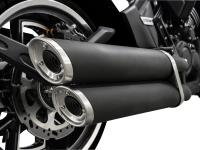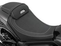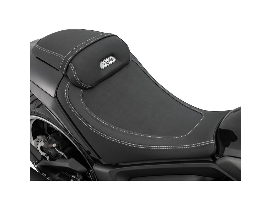 To achieve unrivaled levels of comfort and stability, the C1002V depends on a plush suspension package and updated wheelset. The KYB upside-down telescopic fork provides 120mm of travel and the KYB Pro- link rear shock offers 90mm of cushion to soak up road buzz and bumps. The 130/70R18 front and ultra-wide 240/40VR18 rear Metzeler rubber for a sturdy and controlled ride while the silver and black rims complete the modern look. The front wheel doubles down on the strongest braking system available composed of dual 320mm disc rotors. Both wheels feature J.Juan calipers with Bosch ABS system to achieve safe, predictable braking no matter the conditions. The top-placed passenger seat doubles as a backrest for the main rider and there are footrests for a classic, relaxed cruiser posture.